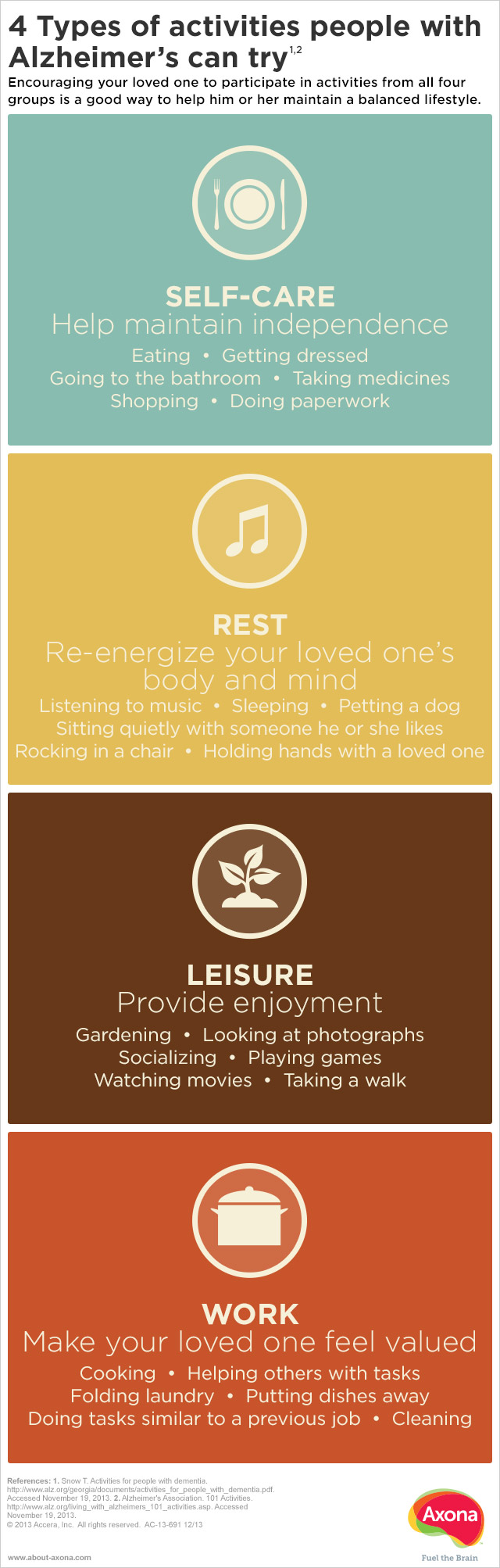 In general, there are four categories of activities in which we participate, and a proper balance among them is key to maintaining equilibrium in our daily lives. Having a balanced lifestyle can also be beneficial to people with Alzheimer’s.